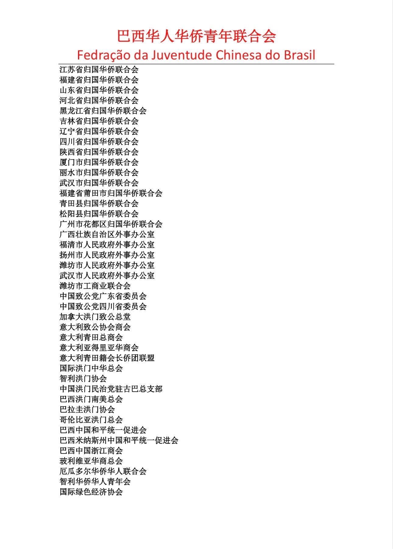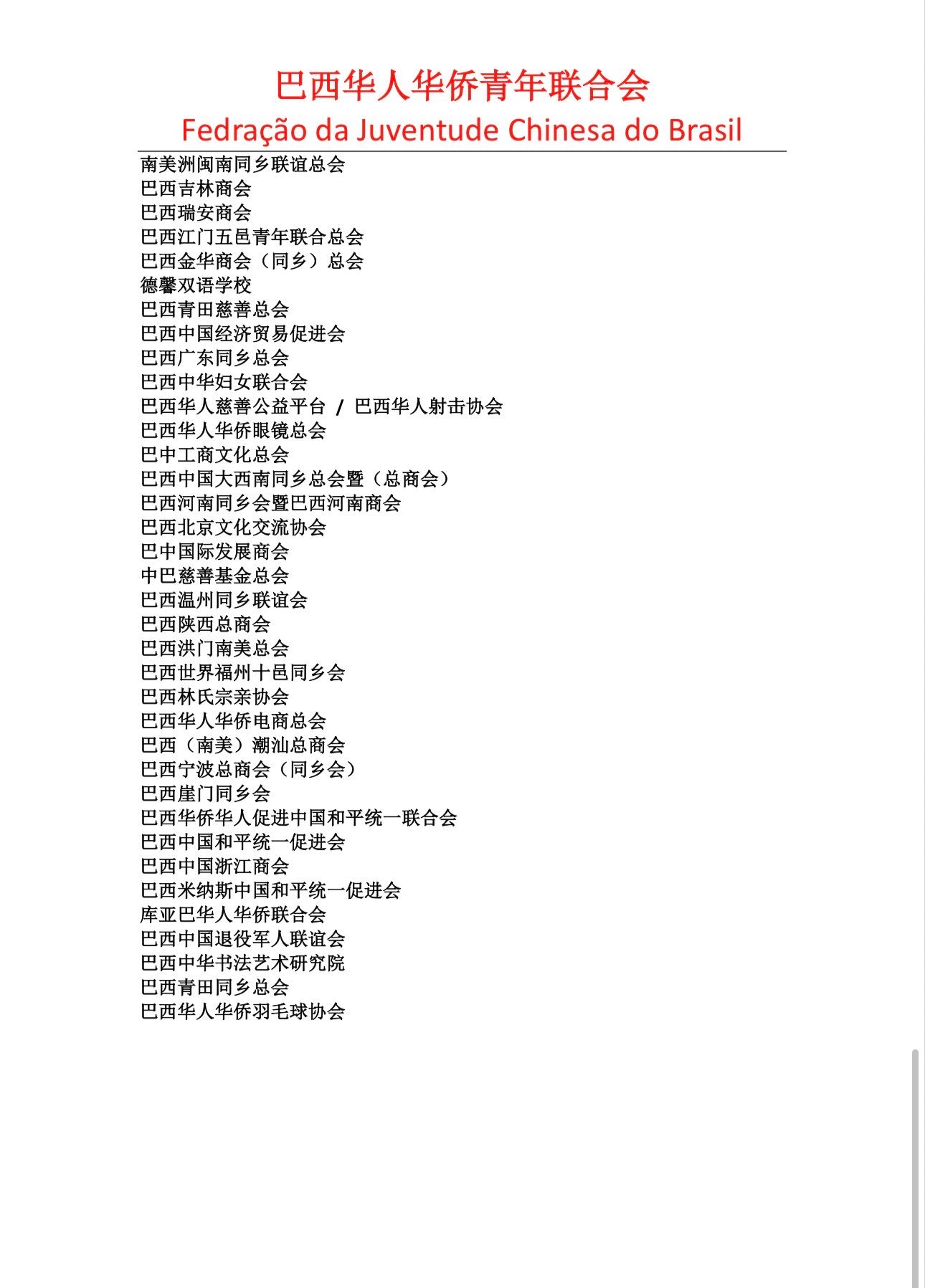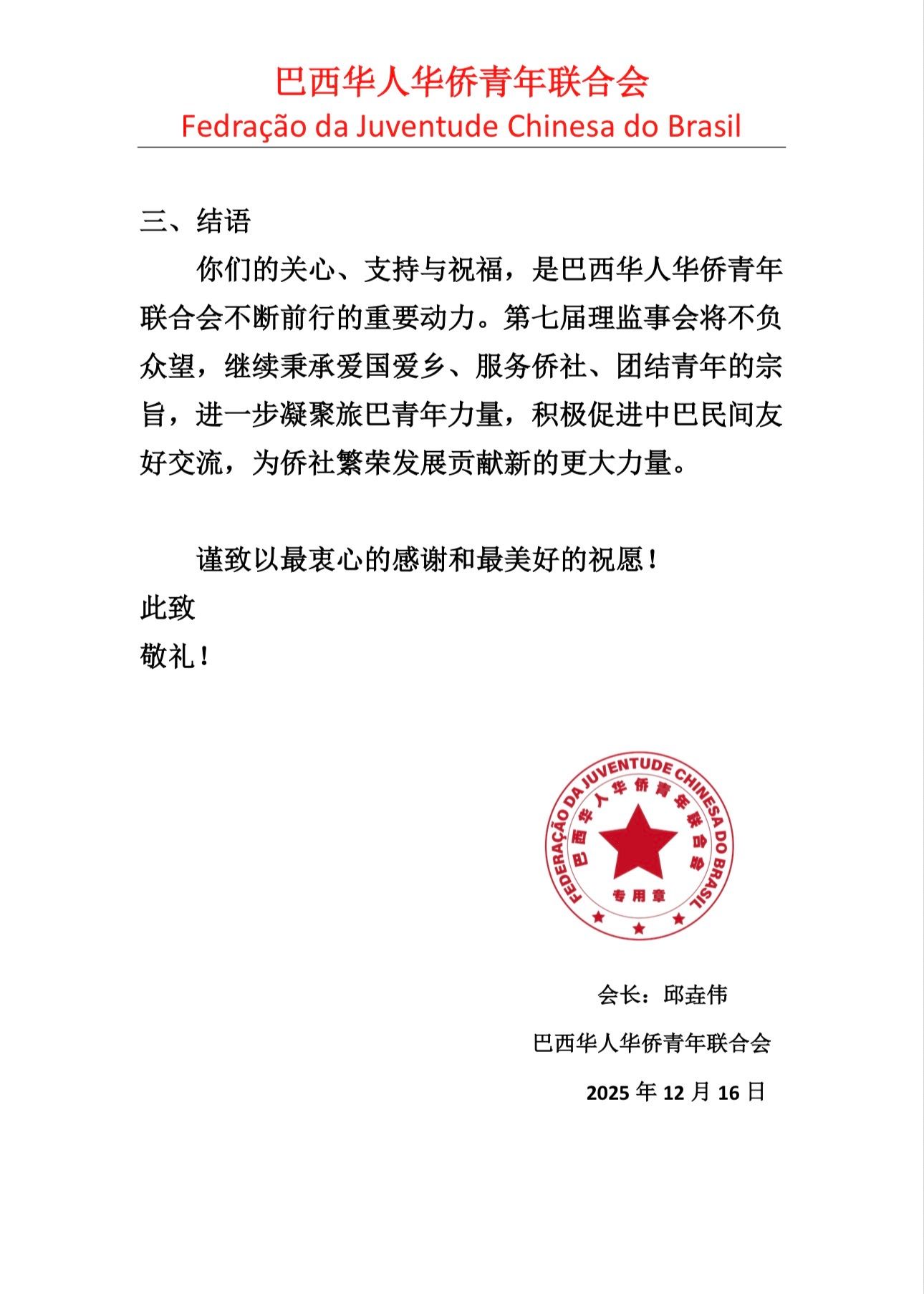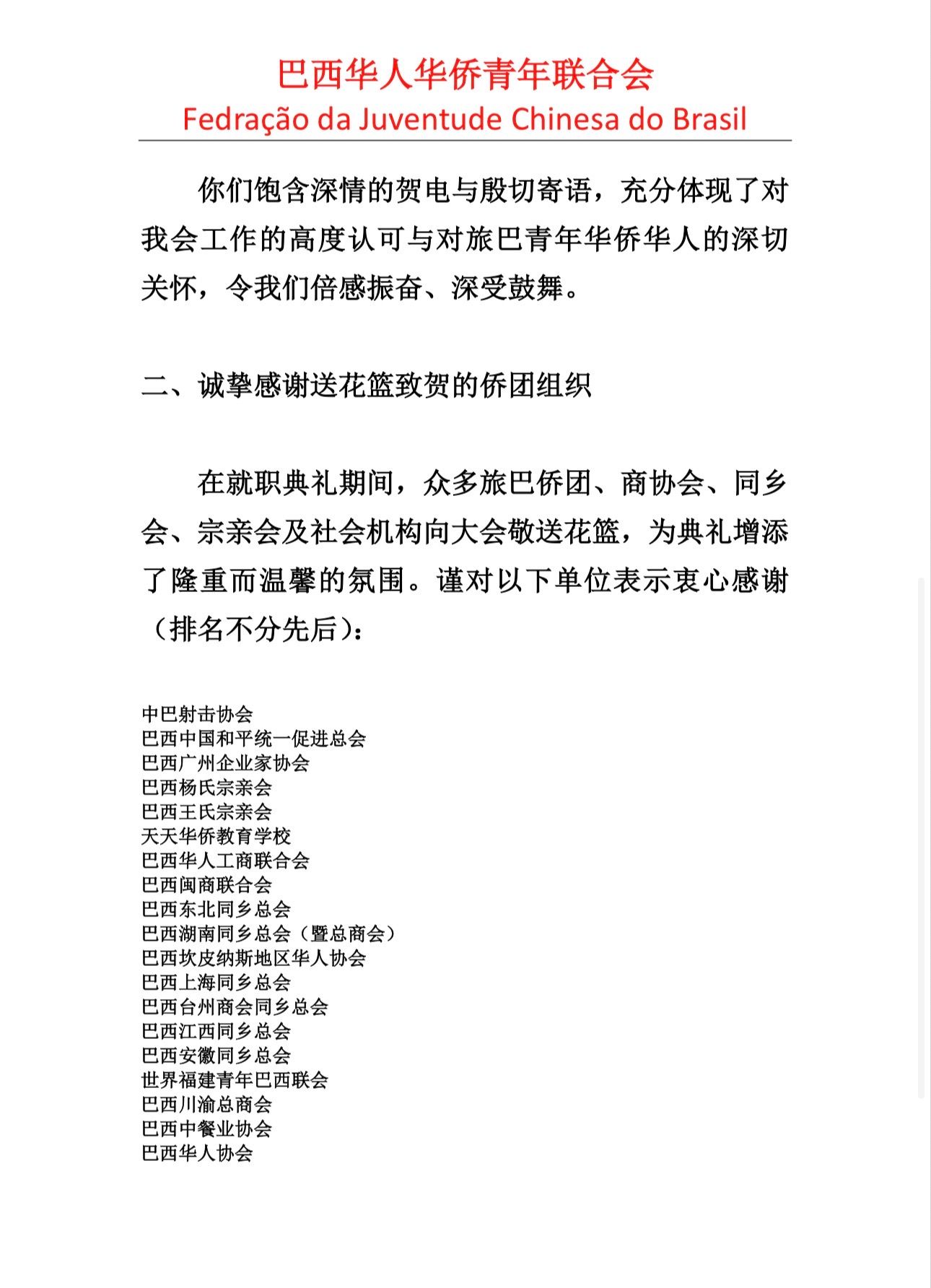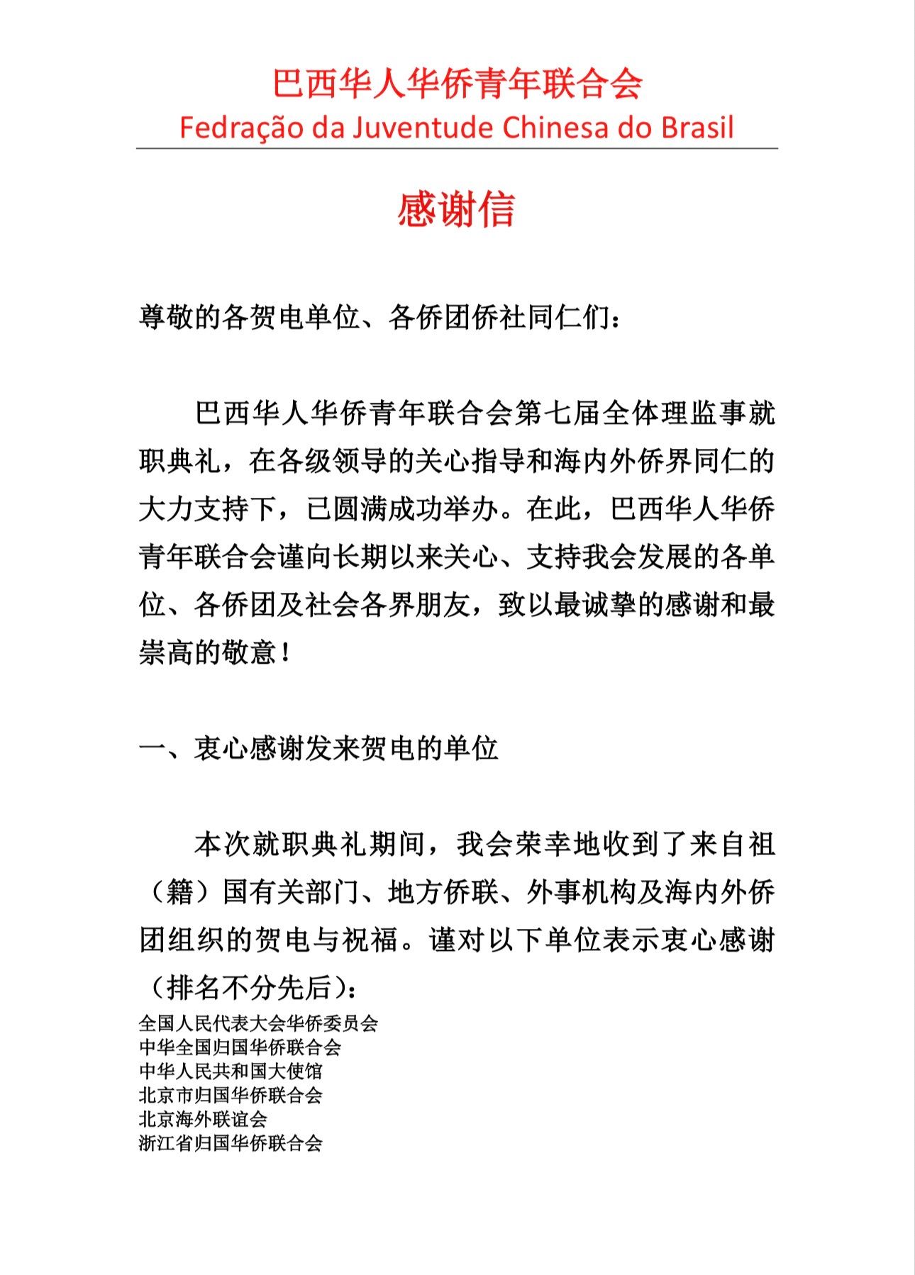 巴西华人华侨青年联合会发表感谢信感谢各界支持