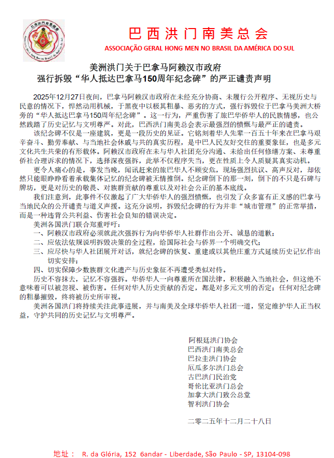 2025年12月27日夜间,巴拿马阿赖汉市政府在未经充分协商、未履行公开程序、无视历史与民意的情况下,悍然动用机械,于黑夜中以极其粗暴、恶劣的方式,强行拆毁位于巴拿马美洲大桥旁的“华人抵达巴拿马150周年纪念碑”。这一行为,严重伤害了旅巴华侨华人的民族情感,也公然践踏了历史记忆与文明尊严。对此,巴西洪门南美总会表示最强烈的愤慨与最严正的谴责。