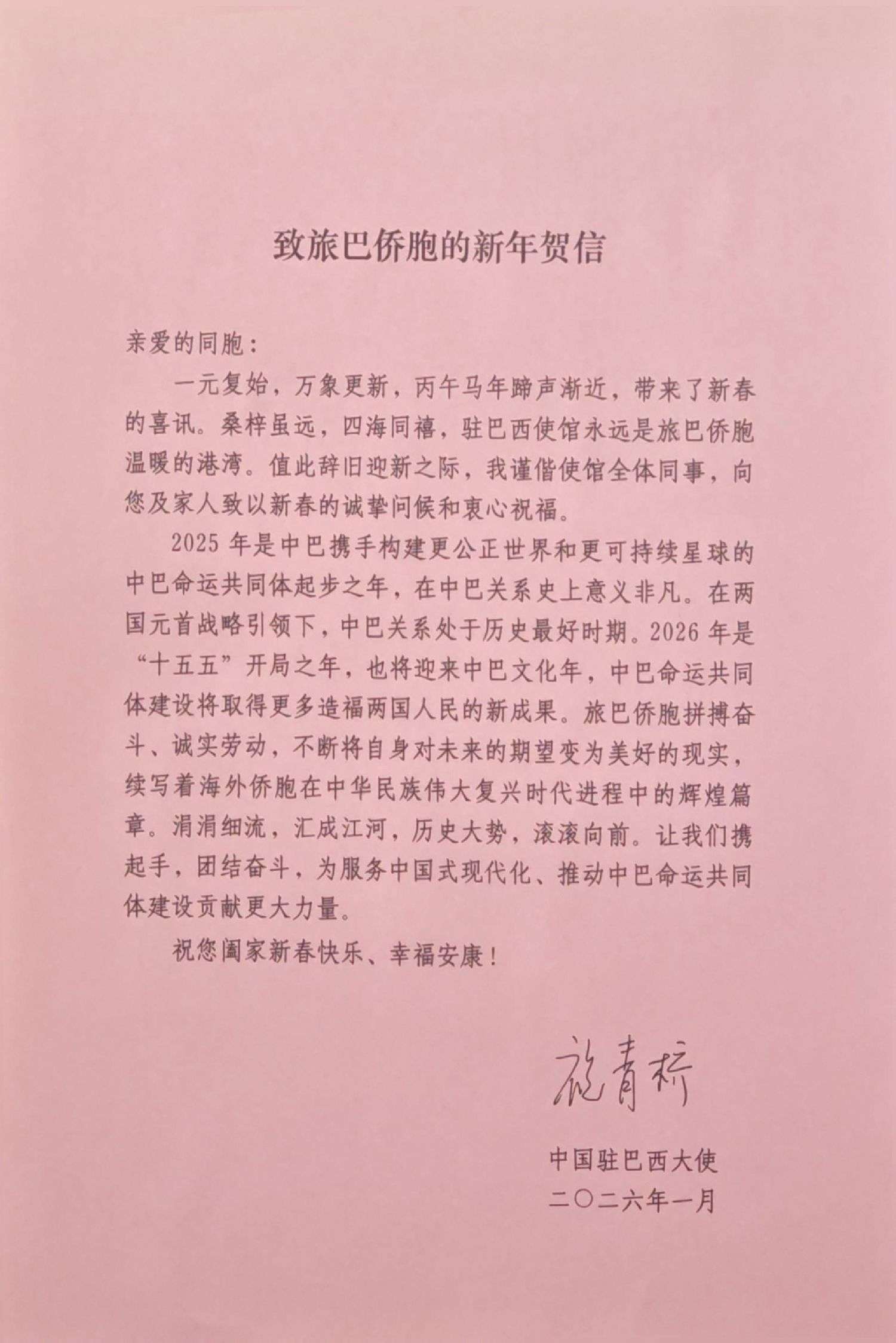 2025年是中巴携手构建更公正世界和更可持续星球的中巴命运共同体起步之年,在中巴关系史上意义非凡。在两国元首战略引领下,中巴关系处于历史最好时期。2026年是"十五五"开局之年,也将迎来中巴文化年,中巴命运共同体建设将取得更多造福两国人民的新成果。旅巴侨胞拼搏奋斗,诚实劳动,不断将自身对未来的期望变为美好的现实,续写着海外侨胞在中华民族伟大复兴时代进程中的辉煌篇章。涓涓细流,汇成江河,历史大势,滚滚向前。让我们携起手,团结奋斗,为服务中国式现代化,推动中巴命运共同体建设贡献更大力量。