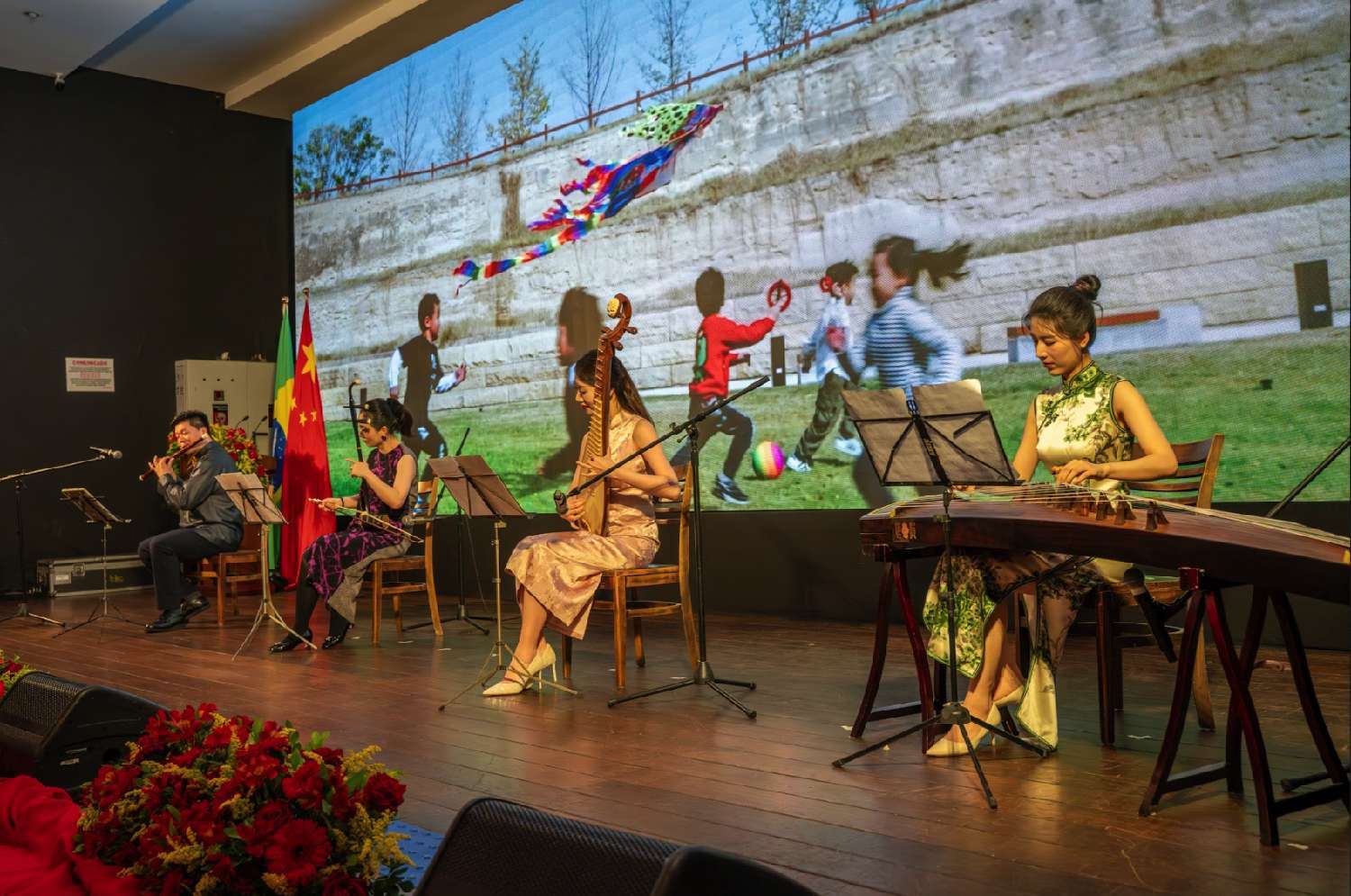 招待会期间,来自中国音乐学院的演奏家们献上了一场精彩纷呈的民族音乐演出,现场以琵琶、二胡、笛子和古琴这样的传统乐器,演奏了《春节序曲》《十面埋伏》《赛马》《扬鞭催马运粮忙》《流水》《喜洋洋》《我和我的祖国》等经典曲目,并特别演绎了巴西歌曲《在路旁》。中西交融的旋律在会场回荡,赢得来宾阵阵掌声,将现场气氛一次次推向高潮,也生动展现了中华传统音乐的艺术魅力与中巴文化交流的深厚情谊。