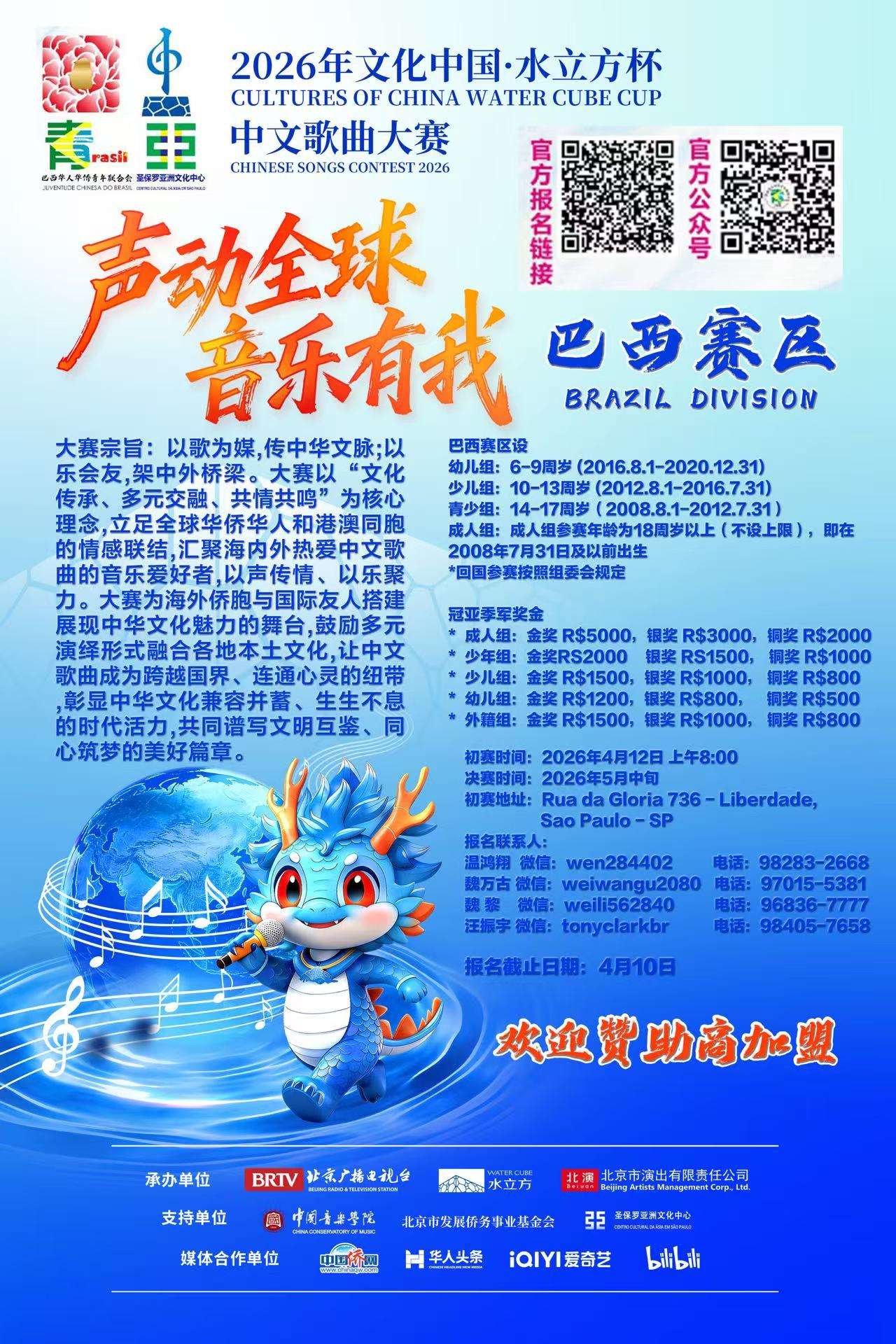 【南美侨报网讯】“声动全球,音乐有我” 2026年文化中国·水立方杯中文歌曲大赛,巴西赛区报名正式启动。