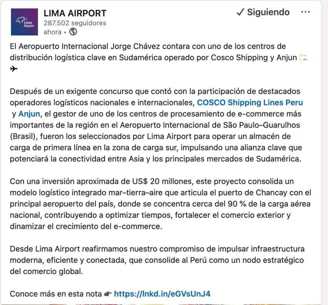 【南美侨报网讯】2月6日,秘鲁利马国际机场运营方Lima Airport Partners(LAP)官方宣布,将豪尔赫·查韦斯国际机场(利马国际机场)机侧货运仓的长期运营权授予中远海运与安骏物流联合体。该项目这不仅是中资企业在海外航空枢纽基础设施领域的重大突破,更是中国物流民营企业与航运巨头携手出海、深度赋能全球供应链的里程碑式时刻。