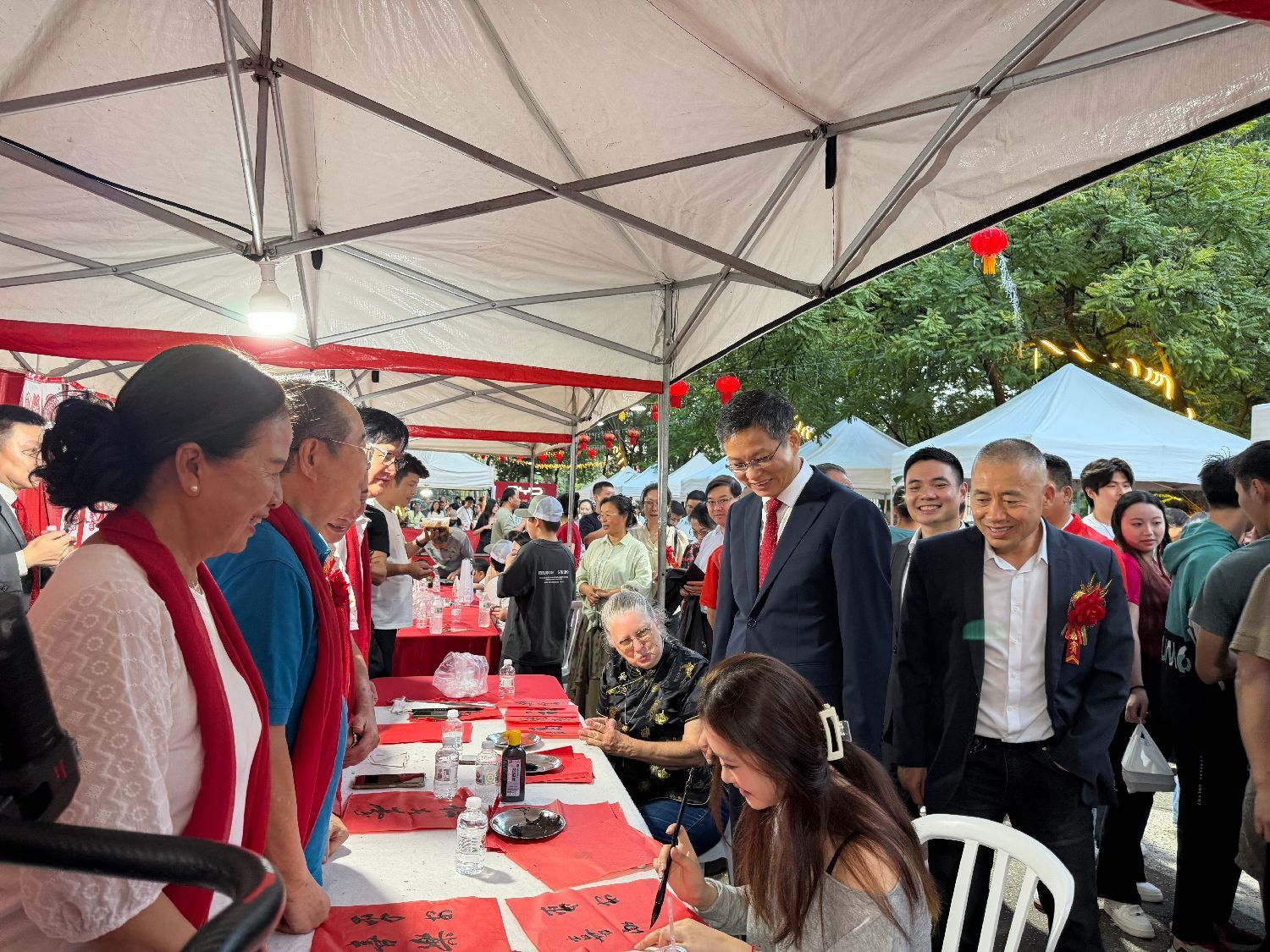 活动现场,大红灯笼高悬,春联、福字相映成趣,浓浓年味扑面而来。中华美食区香气四溢,剪纸、书法作品深受喜爱,中医针灸与推拿体验点前排起长队,中资车企的车展更吸引了大批的侨胞参观,比亚迪、长城、捷途等中国品牌的新款电动吸引众多侨胞观赏咨询。