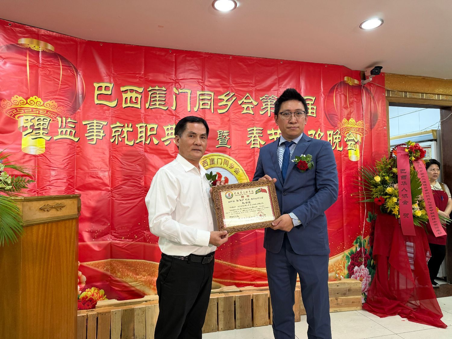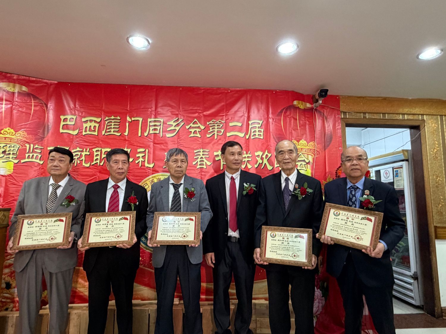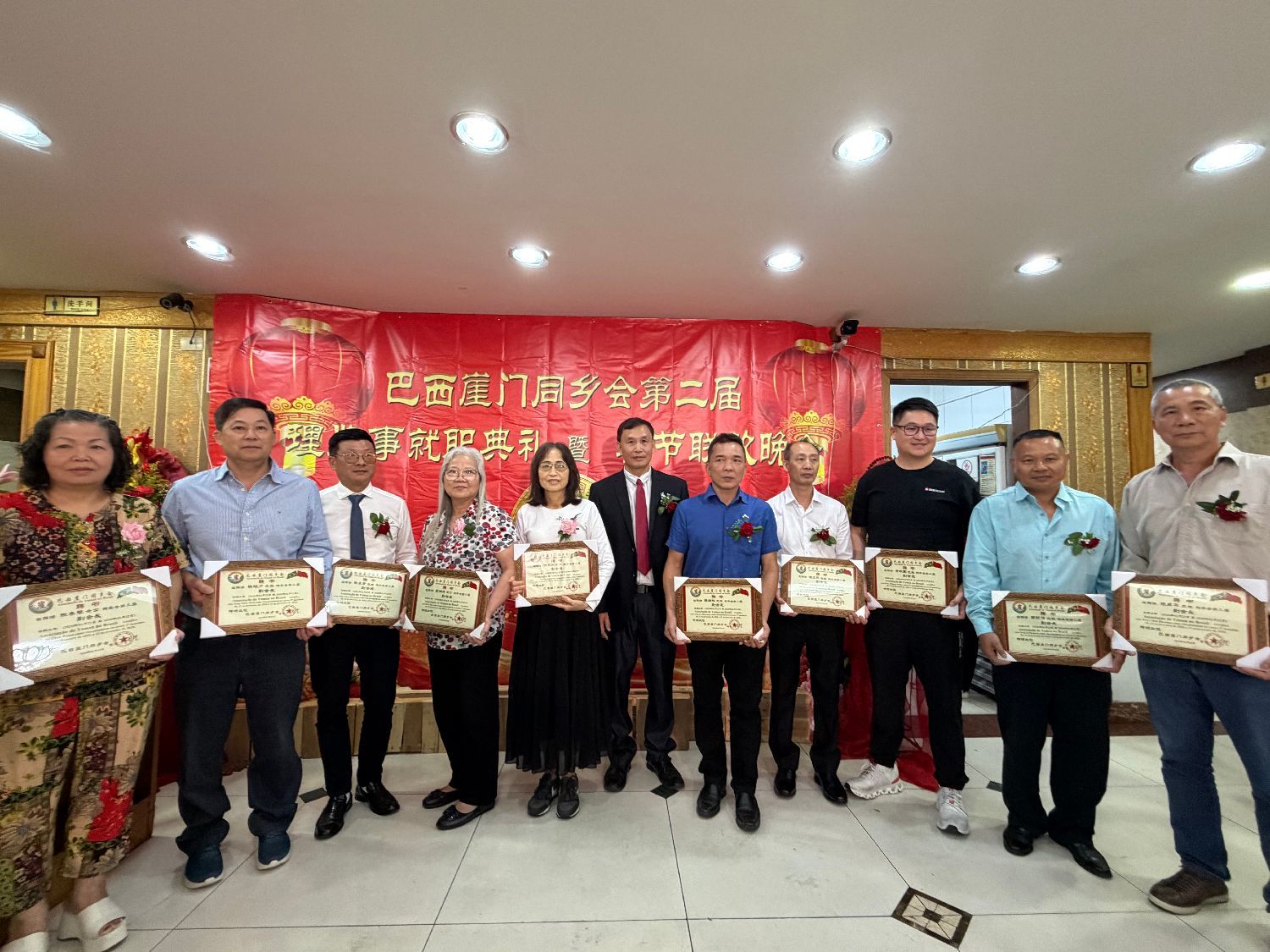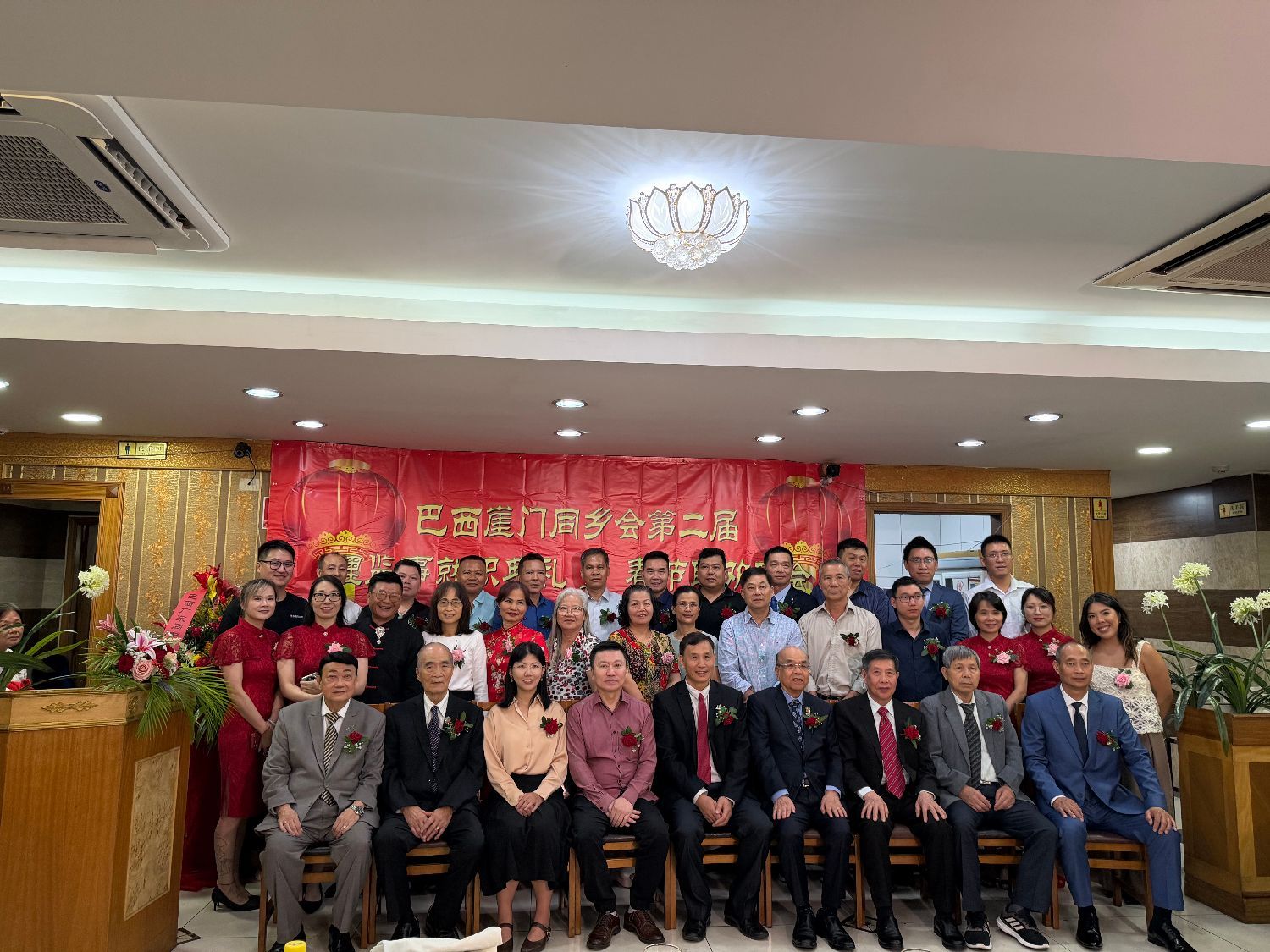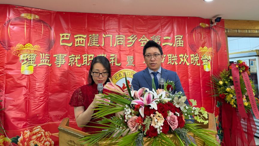 【南美侨报特约记者庄沂圣保罗报道】2月22日晚,巴西崖门同乡会第二届全体理监事就职典礼在聚福楼隆重举行。中国驻圣保罗总领馆领侨处主任荣强、侨务领事梁荣乾,巴西华人协会会长叶周永,广东同乡总会会长苏新效,崖门同乡会会长李长登、监事长陈华远及圣保罗各侨社代表齐聚一堂,共同见证这一重要时刻。