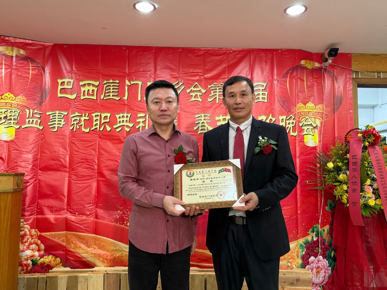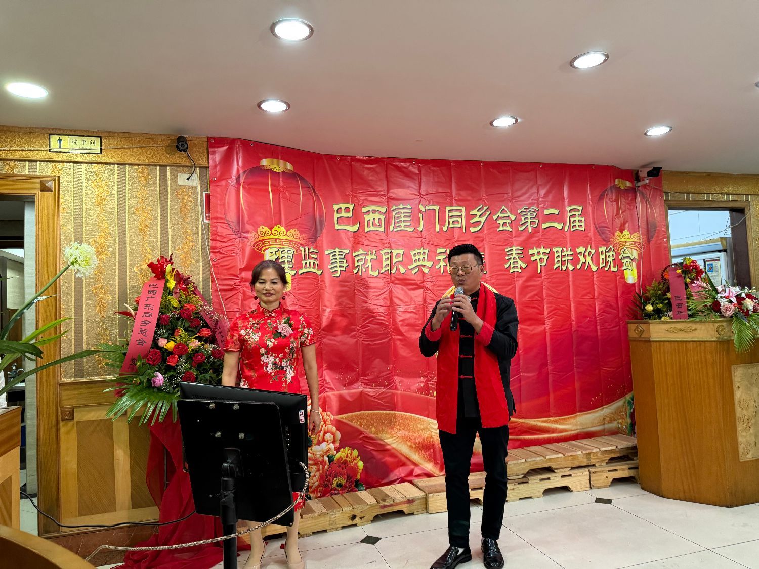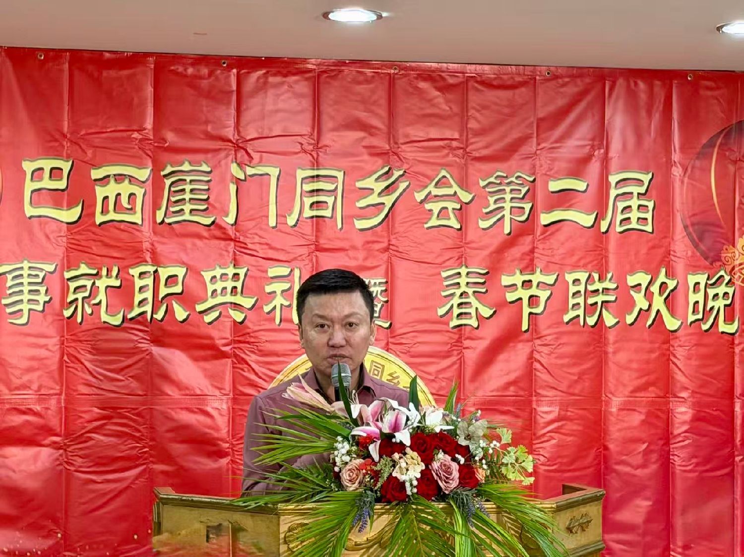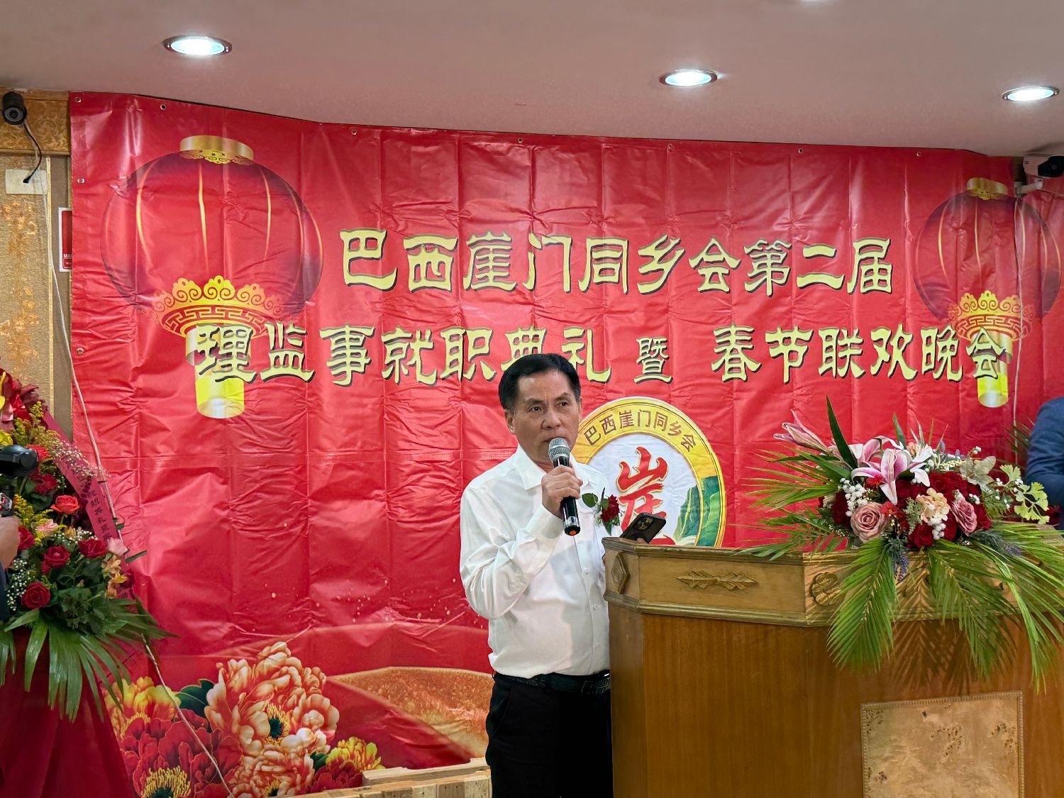 广东同乡总会会长苏新效代表巴西华人协会会长叶周永致辞。他首先向新当选的理监事表示热烈祝贺,并向全体乡亲致以新春祝福。时值2026年农历丙午马年大年初六,喜庆气氛正浓。