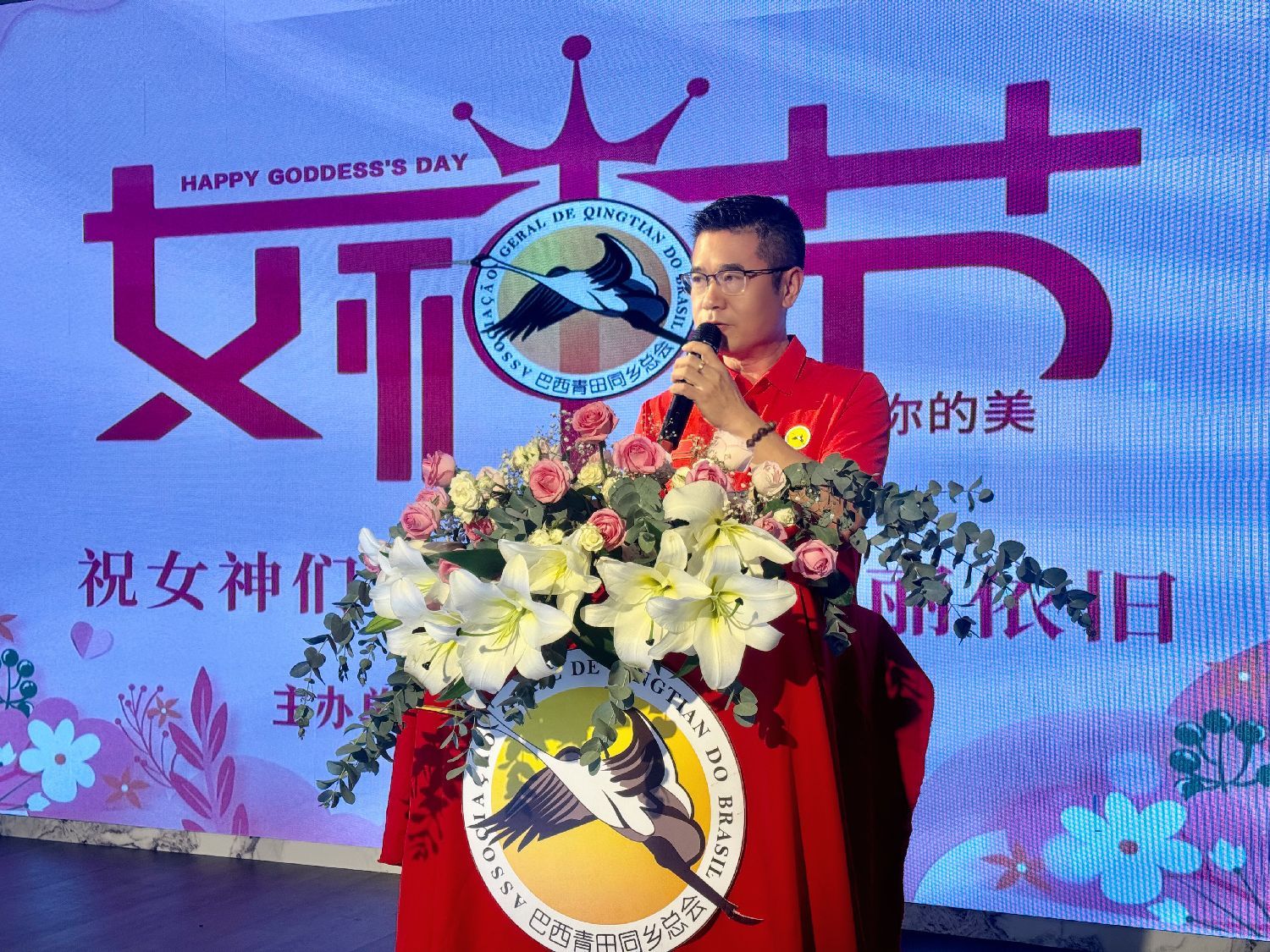 会长张海群在致辞中首先向在场的侨界女性以及广大华侨华人妇女致以诚挚的节日问候。他表示,在巴西这片充满机遇与活力的土地上,青田乡亲从最初的艰苦创业到如今逐渐发展壮大,“每一步都离不开在座各位的辛勤付出”。他特别提到,青田女性在侨社发展和家庭建设中发挥着重要作用,以特有的坚韧与智慧撑起了事业和家庭的“半边天”。张海群表示,举办此次活动不仅是庆祝节日,更是表达一份由衷的敬意,“感谢你们对家庭的默默奉献,感谢你们对同乡会工作的大力支持,更感谢你们在异国他乡依然保持着青田人吃苦耐劳、乐观向上的精神风貌”。他还说,未来巴西青田同乡总会将继续做大家的“娘家人”,不仅关心乡亲们的事业发展,也关注姐妹们的身心健康和生活品质,并通过举办更多丰富多彩的活动,让大家在巴西的生活“既有事业的厚度,也有生活的温度”。