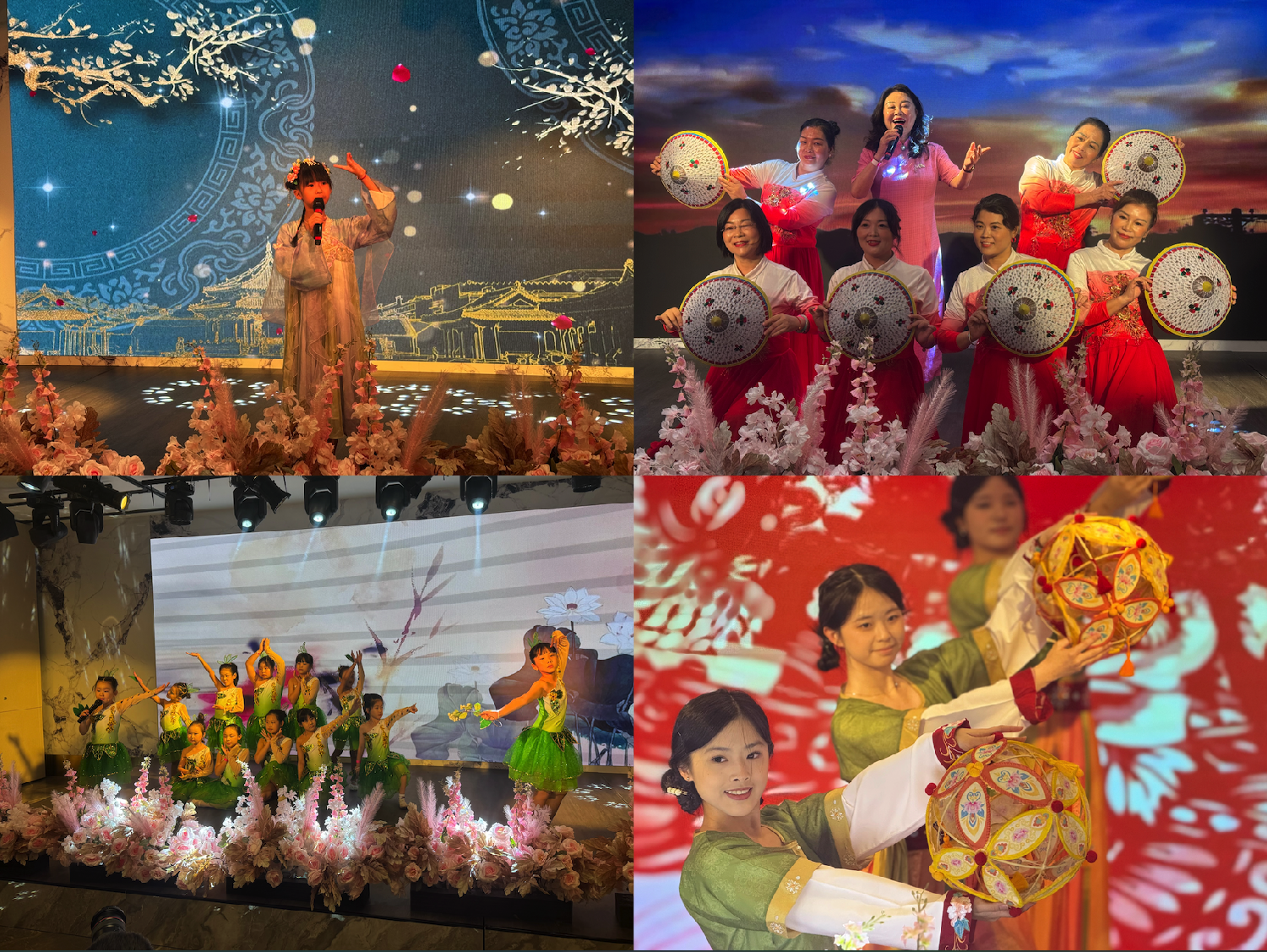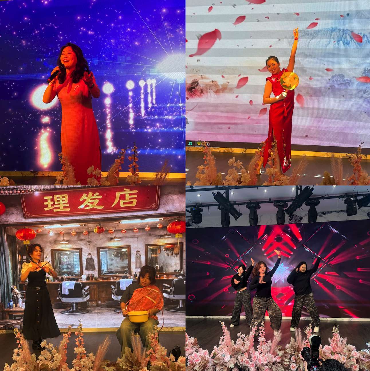 文艺演出环节内容丰富、形式多样。民族舞《闹新春》以喜庆热烈的舞姿点燃现场气氛,幼儿舞《茉莉花》则以天真可爱的表演赢得阵阵掌声。爵士舞《Stage On》与健身舞《珊瑚颂》展现了不同风格的舞蹈魅力,爆笑哑剧《理发》则以幽默生动的表演引来观众阵阵喝彩。华裔小朋友演唱的越剧《打金枝》展示了中国传统戏曲的独特魅力,舞蹈《入画江南》以柔美的舞姿呈现江南水乡的诗意意境,独唱《我的祝福你听见了吗》则用深情歌声表达节日祝福。