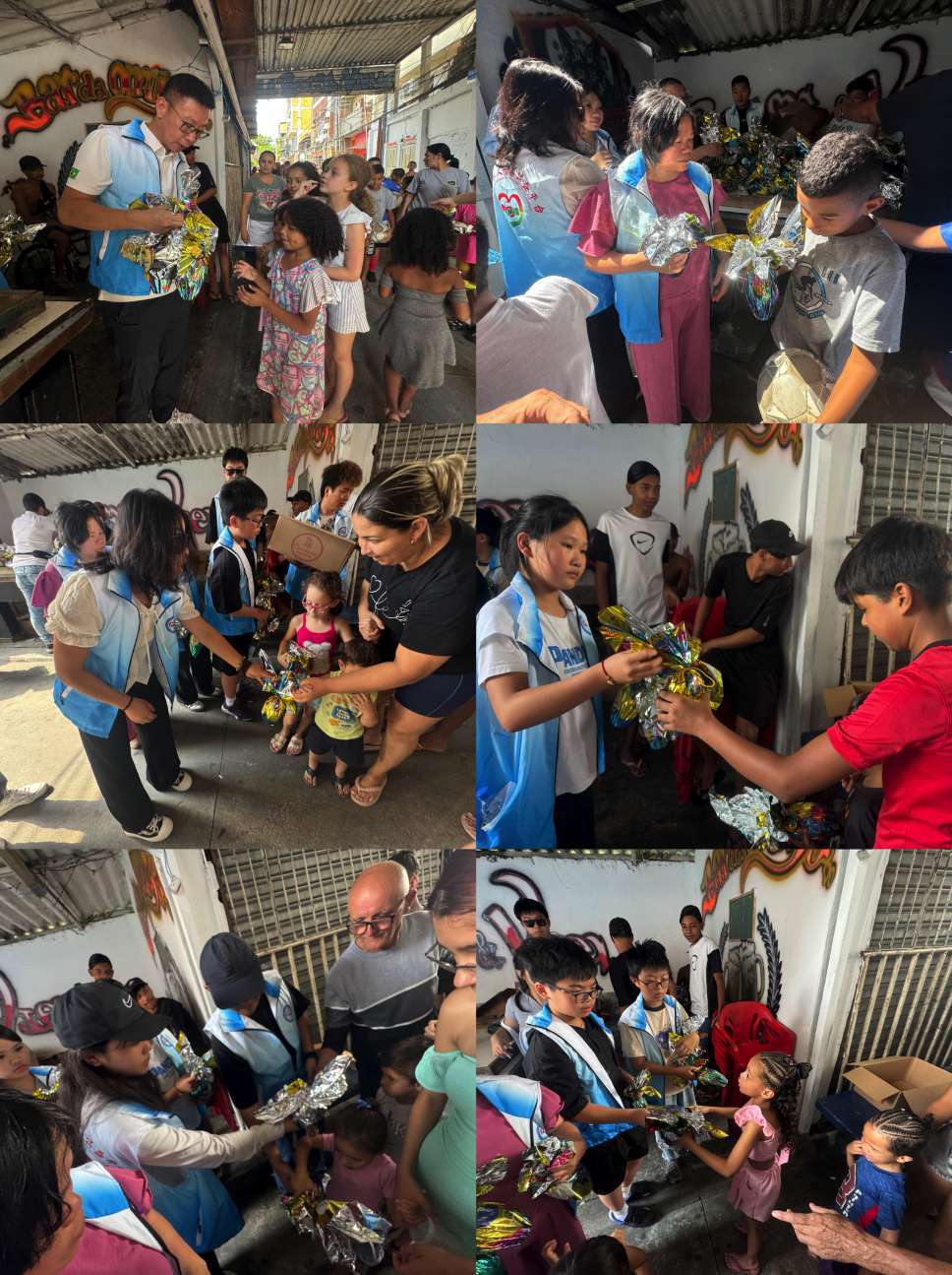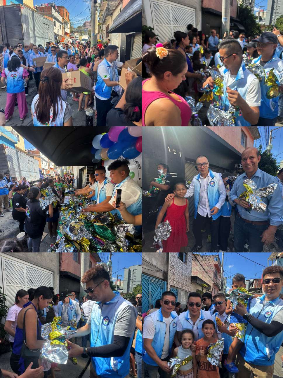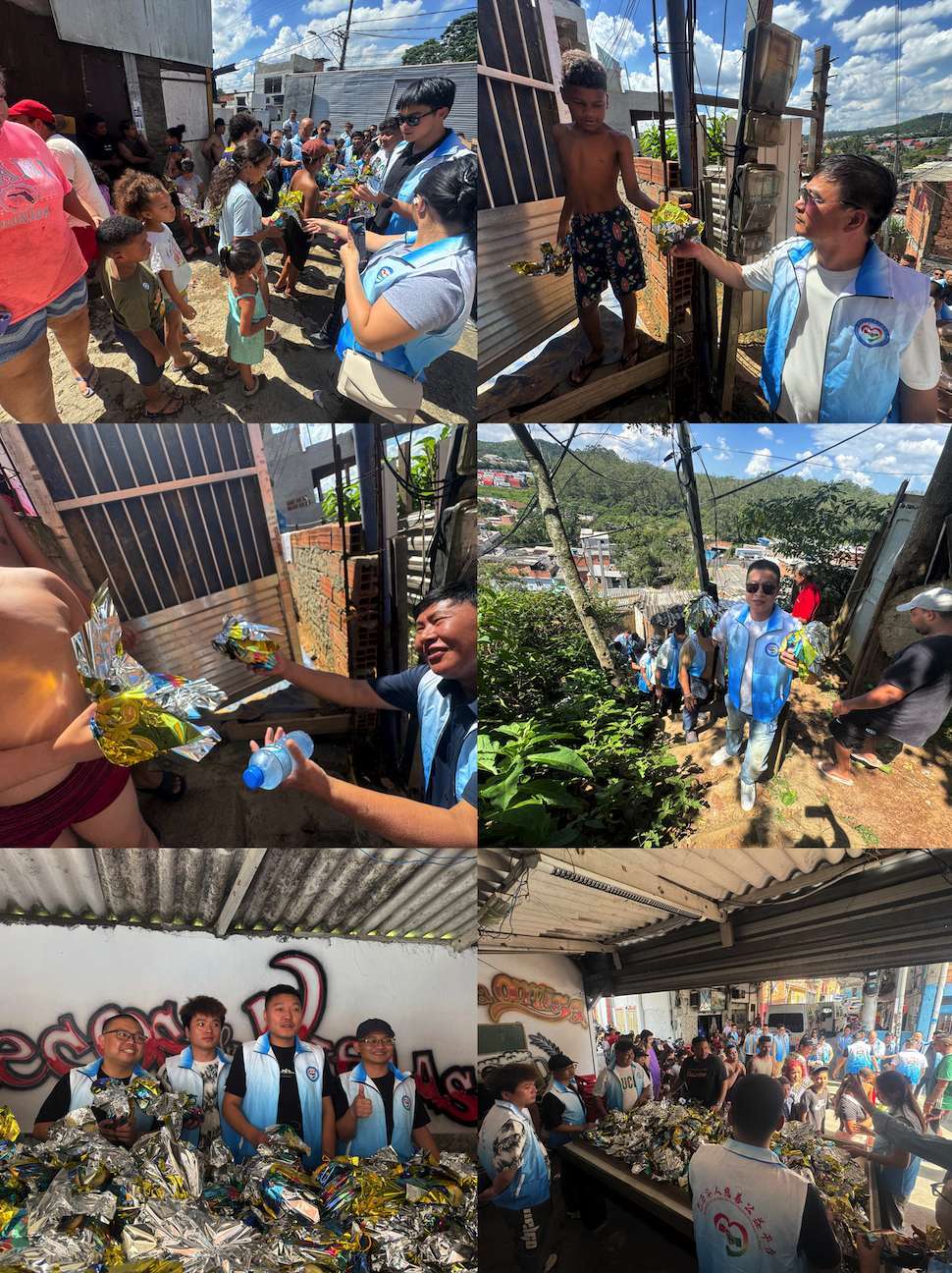 当天圣保罗气温高达32摄氏度,烈日炙烤着街道和屋顶,闷热的空气让人连站在原地都感到吃力。然而,为了让更多孩子及时收到节日礼物,志愿者们仍然分组出发,穿行在狭窄的巷道、坡路和密集的民居之间。有的地方道路狭窄,车辆无法进入,大家只能手提、肩扛着一袋袋巧克力蛋徒步前行。汗水浸湿了衣背,阳光晒得人脸颊发烫,但没有人停下脚步。每当看到孩子们从门口探出头来,带着惊喜接过节日礼物,那一刻,所有的辛苦仿佛都化成了值得。