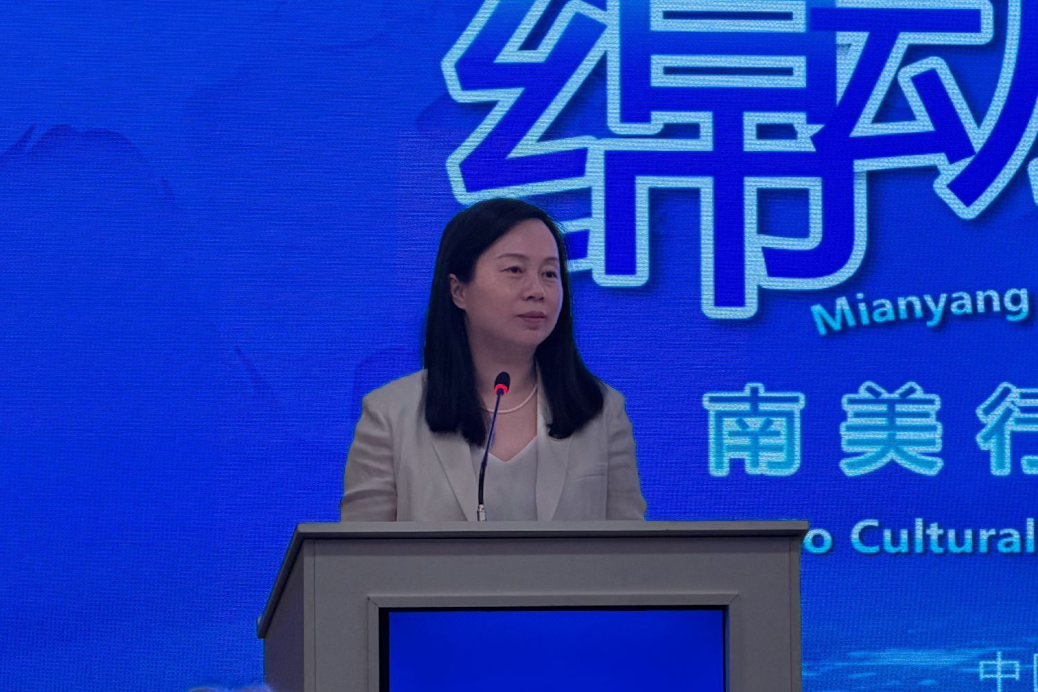张静围绕“现代科技与智慧文旅”作推介,重点介绍无人机烟花秀、低空旅行、沉浸式科学秀场、机器人互动体验等特色项目,展现绵阳科技与文旅深度融合的独特魅力,并诚邀巴西各界朋友到绵阳感受历史文化与山水风光。