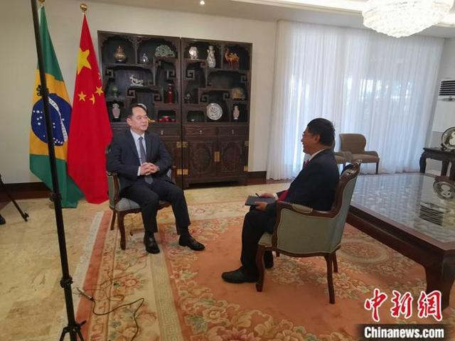 中国驻巴西大使杨万明(左)在巴西首都巴西利亚接受采访。中新网资料图