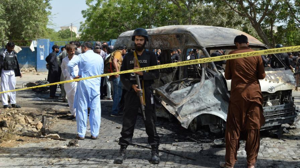 4月26日,安全人员在巴基斯坦卡拉奇查看恐怖袭击现场。新华社