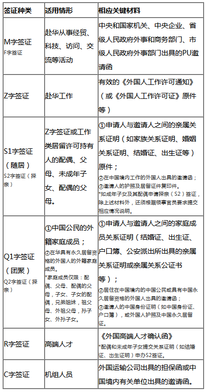 4.中国公民及在华具有永久居留资格的外国人的外籍家庭成员(即配偶、父母、配偶父母、子女、子女配偶、兄弟姐妹、祖父母、外祖父母、孙子女、外孙子女)可申请赴华团聚或探亲签证。