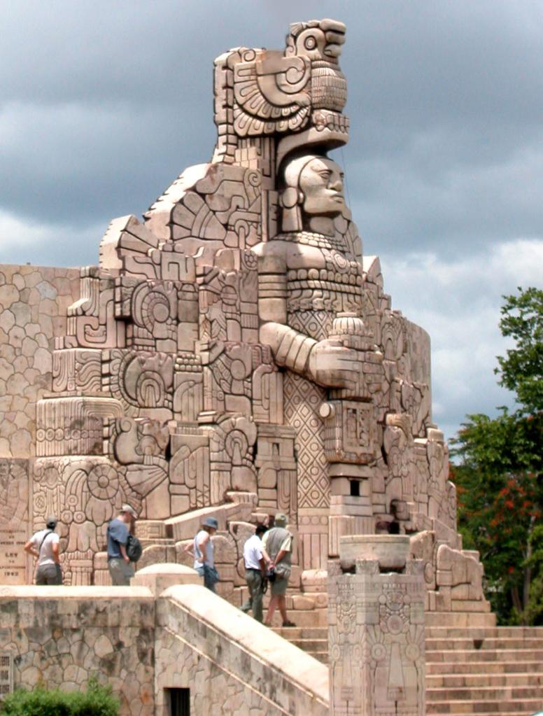 资料图:几名游客经过位于墨西哥东南部尤卡坦州首府梅里达的一处表现古玛雅人形象的城市建筑。新华社