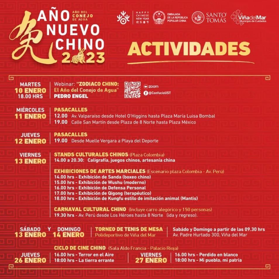 1月10日-27日,中国驻智利使馆将联合维亚德尔马市政府、圣托马斯大学孔子学院、维亚德尔马乒乓球协会,为刚刚经历重大火灾的维市人民带来抚慰人心的中国文化活动,内容包括:线上研讨会“十二生肖-兔”,花车游行,舞龙舞狮表演,武术和气功表演,“中国杯”乒乓球比赛,中国电影展(将播放《流浪地球》等四部影片),中国工艺品售卖、唐装汉服体验及小游戏等。具体时间地点请见海报。