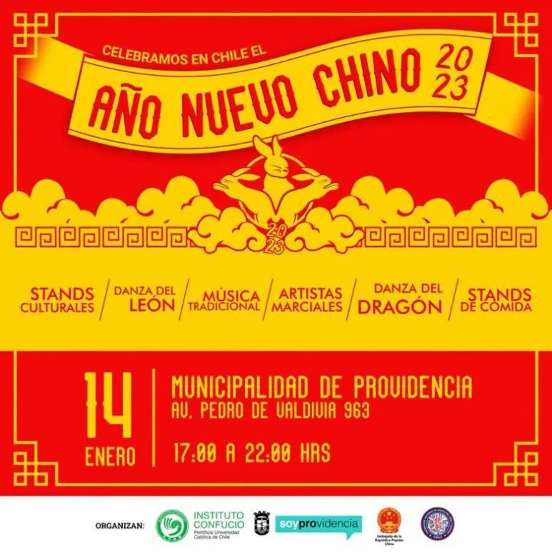 1月14日,中国驻智利使馆将联合普罗维登西亚市政府、智利天主教大学孔子学院、舞龙舞狮联合会共同举办"中国春节"庆祝活动。活动将在普罗维登西亚市市政广场举行,地址是Av.Pedro de Valdivia963。届时周边将封锁三个街区,请您留意,步行前往。活动将包括文化展台、手工艺品、武术表演、传统音乐、中国食品展台、儿童活动、舞龙舞狮狂欢节等。具体时间地点请见下表: