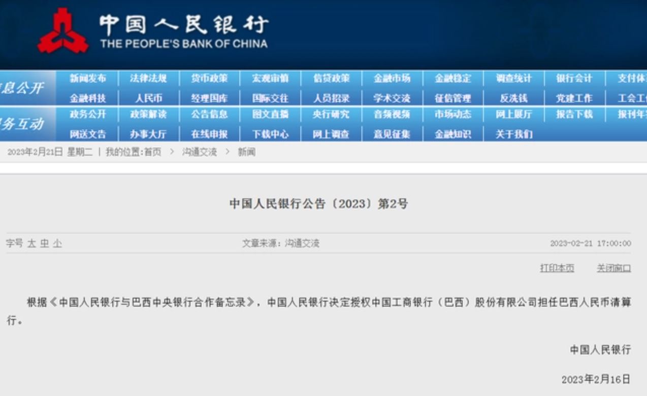 中国人民银行21日发布公告,授权中国工商银行(巴西)有限公司(以下简称“工银巴西”)担任巴西人民币清算行。