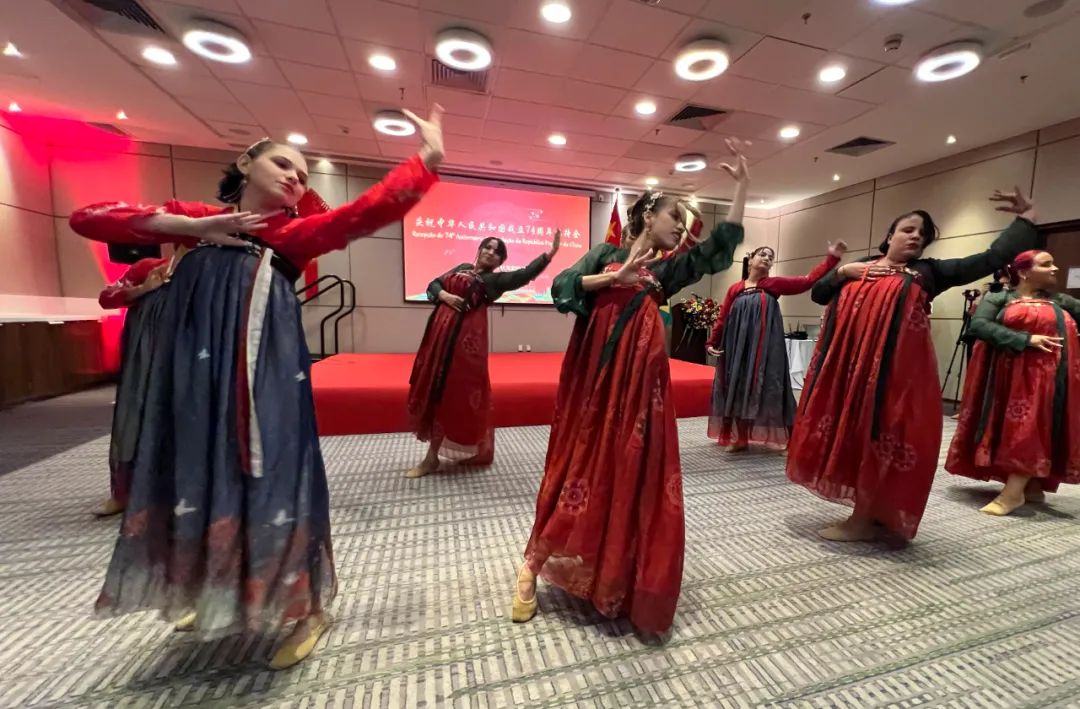 招待会现场气氛热烈,伯南布哥大学孔子学院巴西学员表演了精心准备的中国传统舞蹈。参加招待会的嘉宾纷纷表达祝福,并积极评价中国发展建设成就。