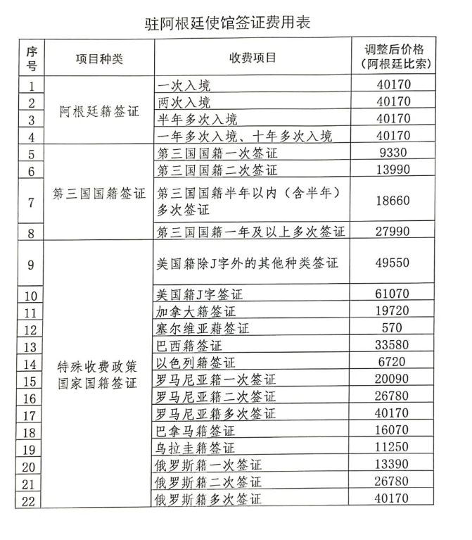 中国驻阿根廷使馆签证费用调减