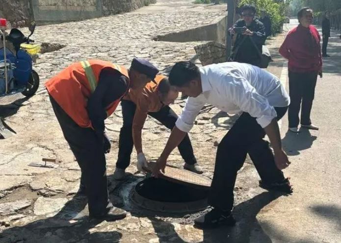 5月8日,山西省灵丘县下沿河村,委内瑞拉驻华大使馆外交官赫苏斯·皮雷帮助村民将被移开的沉重井盖放回原位。
