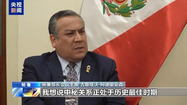 秘鲁部长会议主席古斯塔沃·阿德里安森接受采访。大陆央视