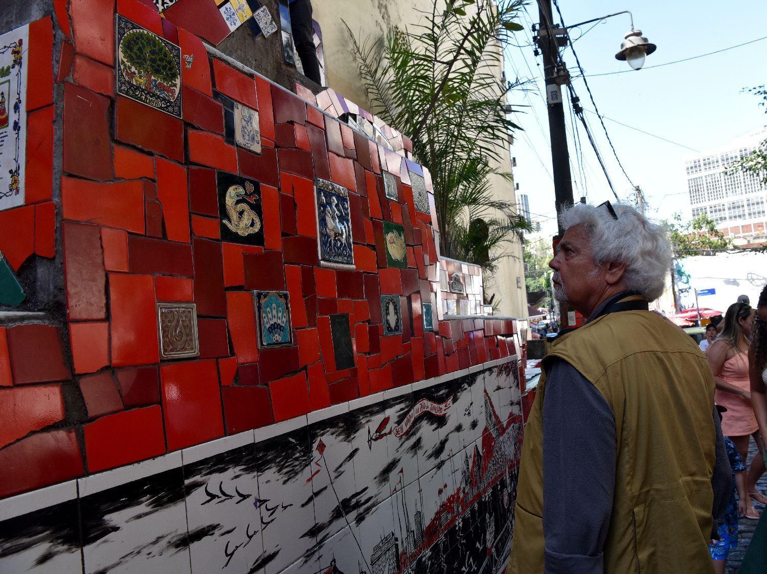10月15日,巴西里约热内卢,一位游客在塞拉隆阶梯上端详中国瓷砖。中新社