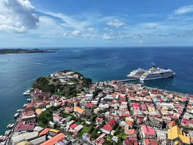 两艘邮轮停靠在格林纳达首都圣乔治海港。新华社