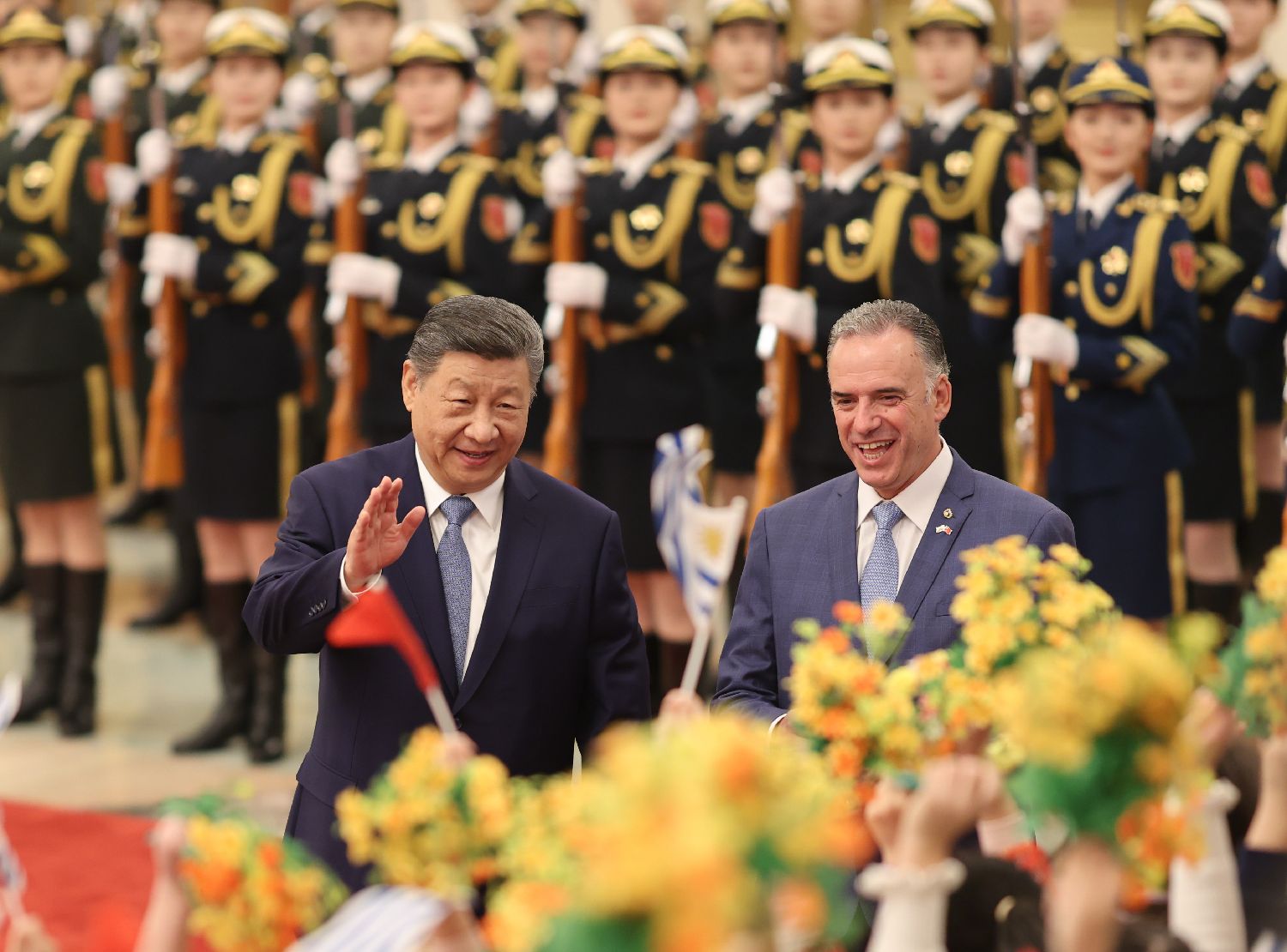 北京时间2月3日上午,中国国家主席习近平在北京人民大会堂同赴华进行国事访问的乌拉圭总统奥尔西举行会谈。会谈前,习近平在人民大会堂北大厅为奥尔西举行欢迎仪式。中新社