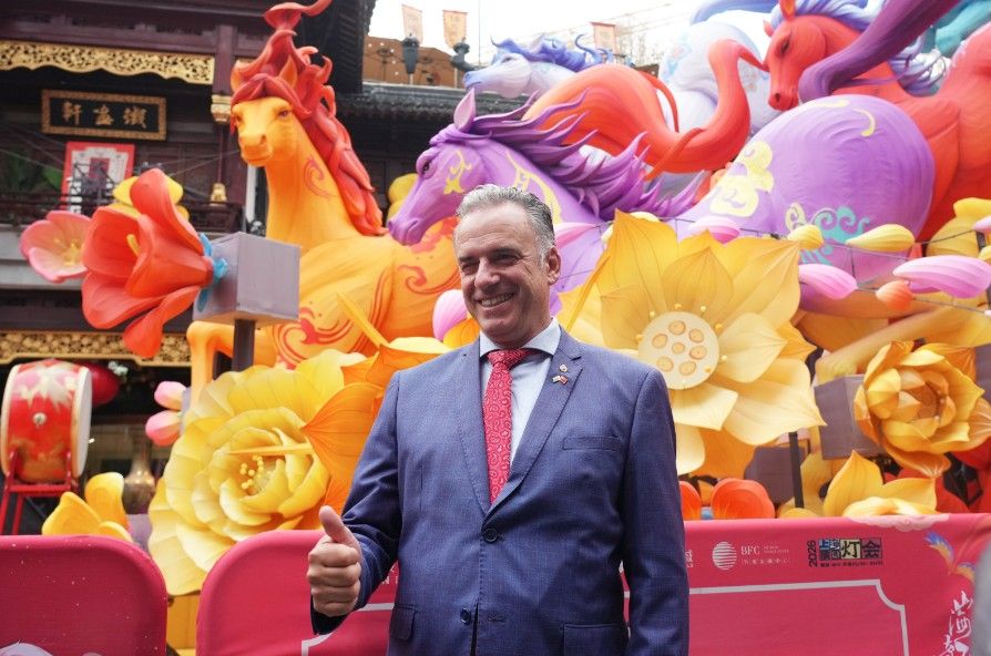 2月5日,乌拉圭总统奥尔西到访上海豫园。图为乌拉圭总统奥尔西与豫园马年主题彩灯合影。中新社