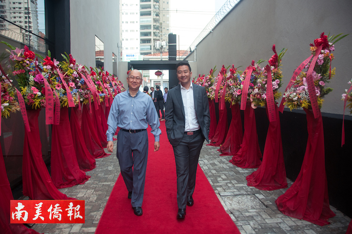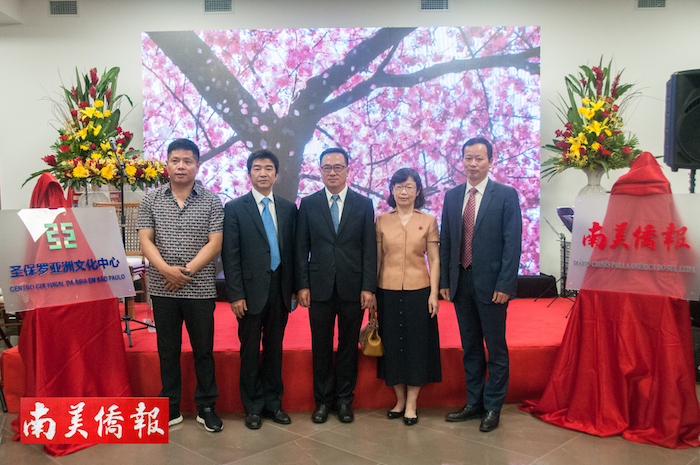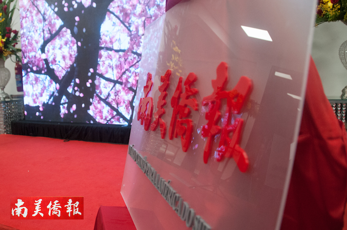 致词结束后,《南美侨报》社长、圣保罗亚洲文化中心总裁方三京,中国驻圣保罗总领事陈佩洁、华人协会会长张伟、中资企业协会副会长张广华为《南美侨报》、圣保罗亚洲文化中心揭牌。 图片 罗丹 摄
