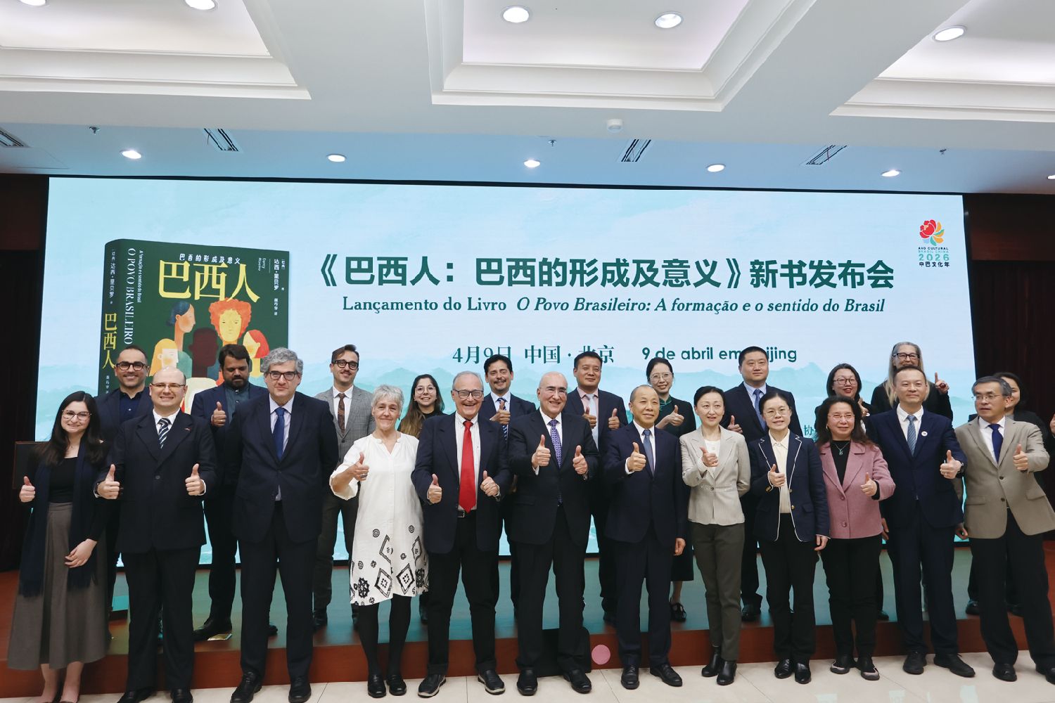4月9日,2026“中巴文化年”的第二场活动暨巴西国宝级作家达西•里贝罗(Darcy Ribeiro)的代表作《巴西人:巴西的形成及意义》(下称《巴西人》)中译本新书发布会在北京举行,来自中巴各界的嘉宾代表及中外媒体记者近百人参加。 图为出席《巴西人》中译本新书发布会的中巴各界嘉宾代表合影留念。(晓菲/摄)