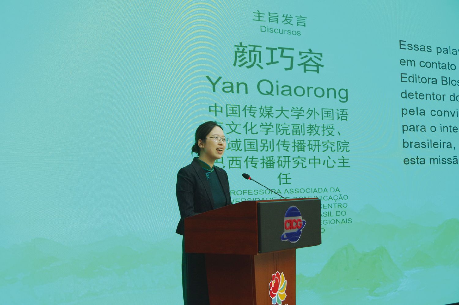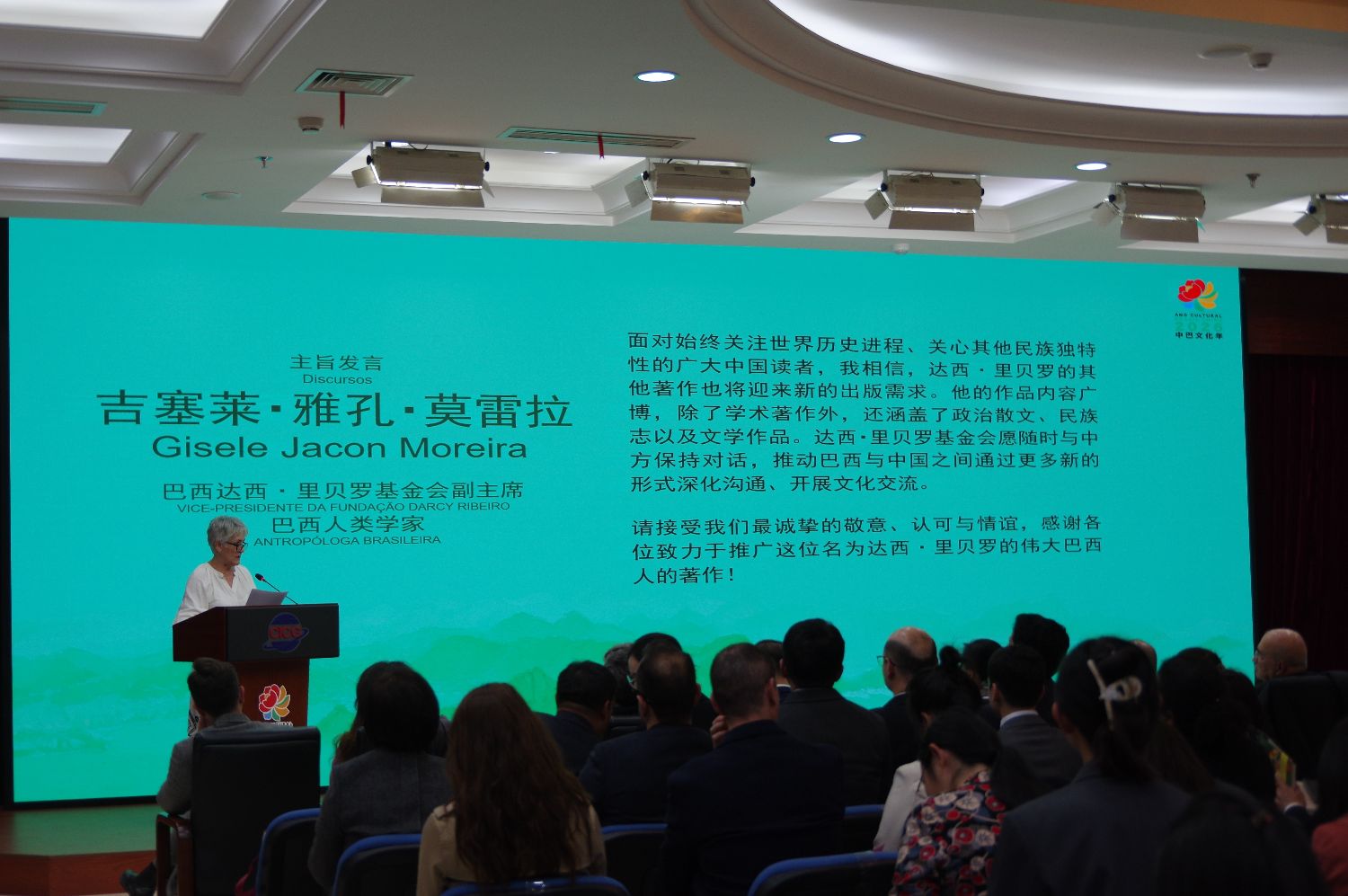 4月9日,巴西人类学家、达西•里贝罗基金会副主席吉塞莱•雅孔•莫雷拉在发布会上介绍达西•里贝罗。(晓菲/摄)