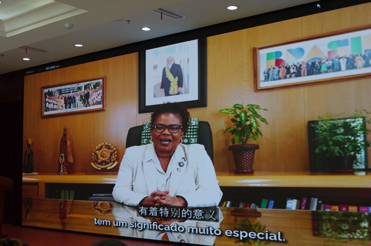 4月9日,巴西文化部部长马格蕾斯•梅内塞斯向发布会发表视频致辞。她指出,希望文化继续作为鲜活的凝聚力,带着相互尊重之心,构建巴中共同的未来。(晓菲/摄)