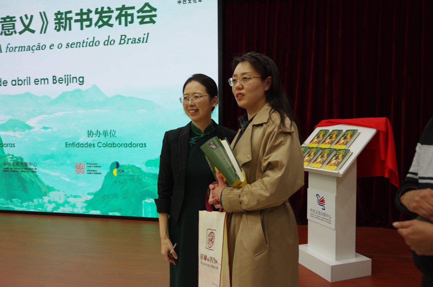 4月9日,《巴西人》中译本的译者、中国传媒大学外国语言文化学院副教授颜巧容(左)在发布会现场与读者合影留念。(晓菲/摄)