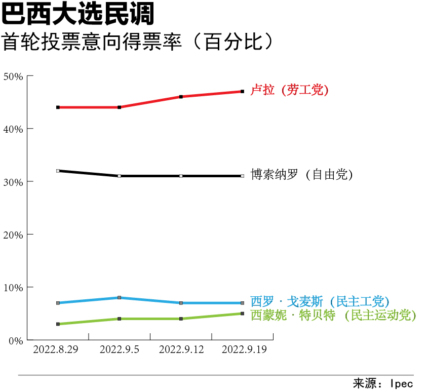 巴西2022年总统大选将于10月2日举行,如果没有候选人获得超过50%的选票,将在10月30日举行第二轮投票。目前,两名“热门”候选人——现任总统博索纳罗与前总统卢拉之间的竞争已经进入白热化阶段,“花式”拉票造势。多项民调显示,卢拉目前的支持率高于博索纳罗,有望在第二轮投票中胜出。
